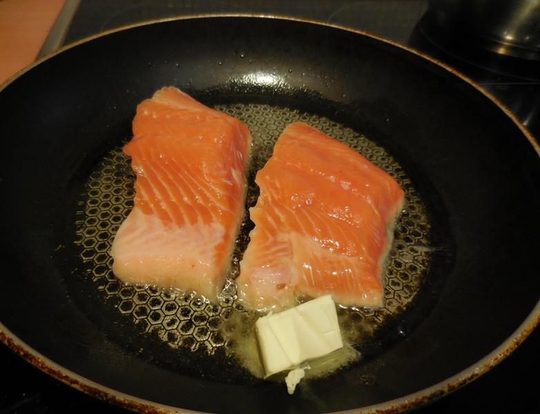 Итак, опустили в разогретое масло первую порцию форели. Немного убавили огонь, чтобы растительное масло не подгорало, и добавили к нему небольшой, граммов на 50, кусочек сливочного. Животные масла плотнее своих растительных собратьев, поэтому сливочное, обволакивая порционный кусочек тонкой пленочкой, при переворачивании форели на другую сторону, должно немного подрумянить нашу рыбку.
