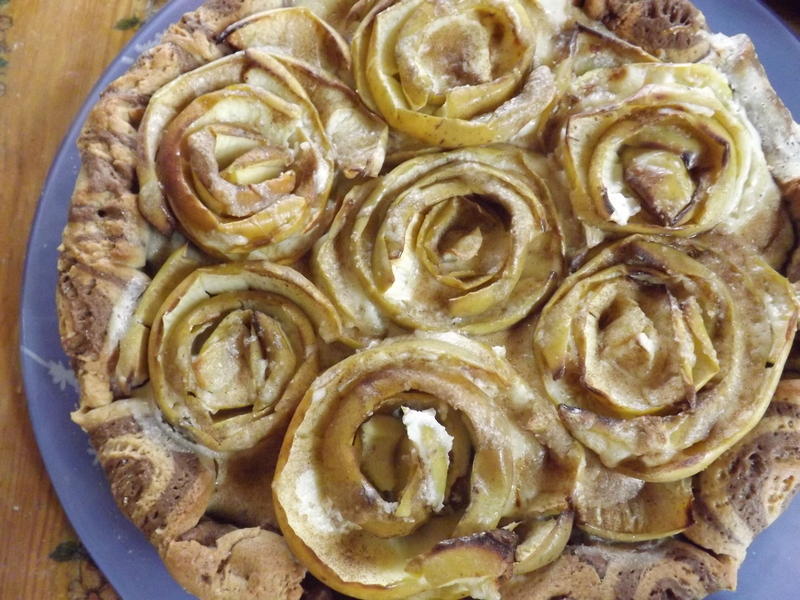 Еще один оригинальный рецепт пирога с яблоками, у него есть различные вариации теста и крема, а яблоки выкладываются в форме роз. Пирог очень праздничный, нарядный, идея была взята из Интернета, но сам рецепт там другой, пока не пробовали. У пирога на фото (под статьей) тесто получилось тоже с розами. Форма была выложена срезами песочного теста, завернутого рулетом из двух слоев — обычного и шоколадного.