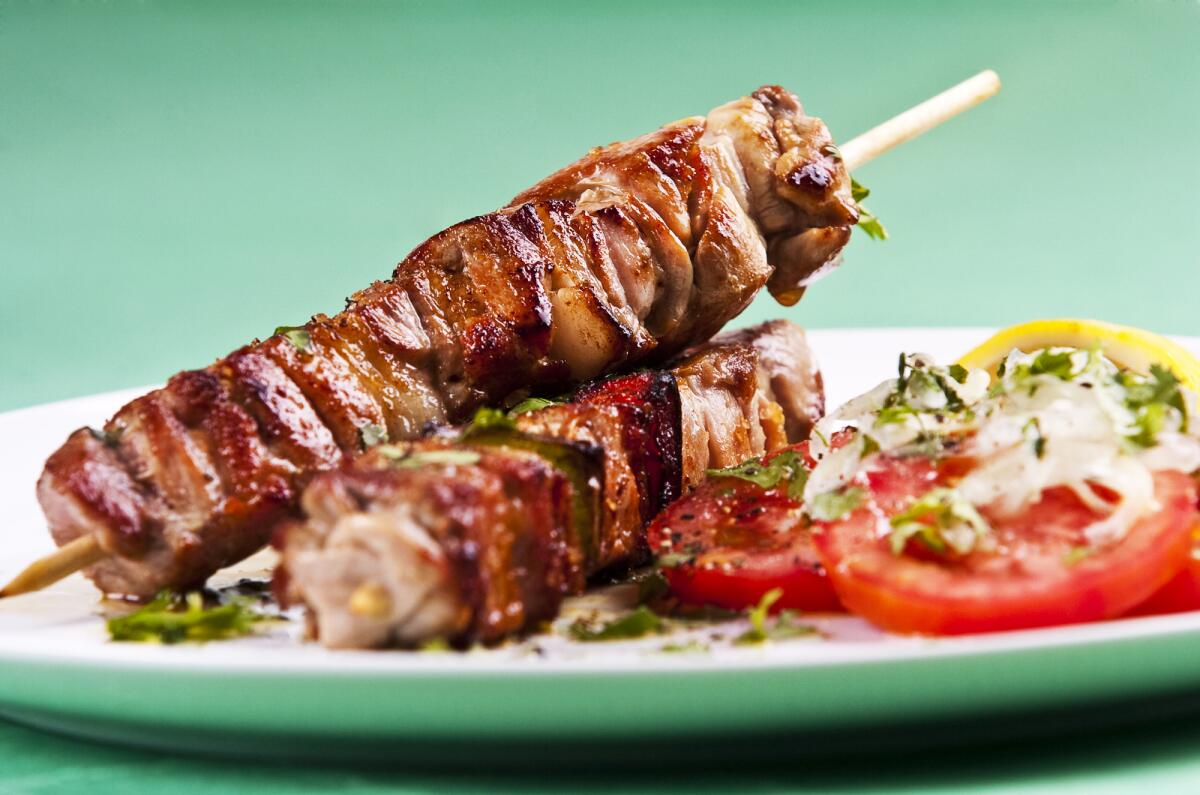 Готовый, только с огня шашлык подаем с томатами, запеченными баклажанами, перцами и зеленью. Хорошо сделать к шашлыку овощи-гриль, подать различные пикантные соусы, острые или пряные — это уже кто что любит.