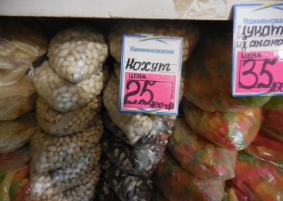 Вот, Александр. - первый, ближний к моему дому (буквально 200-300 м от него) овощной киоск. Здесь этот горох обзывают "нохут". Правда, чтобы разглядеть сам горох, надо присмотреться к снимку. Он в верхних двух пакетах, которые почти полностью прикрыты ценником. Третий пакет сверху - это уже белая фасоль.