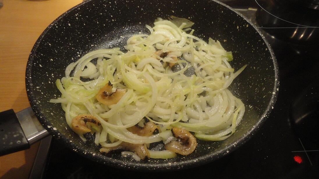 Пока же вытапливается смалец, у нас есть время не только почистить, но и пошинковать полукольцами среднюю головку репчатого лука. Его мы обжарим первым. А как только лук зазолотится, станет мягким, отправим на сковородку грибы. Поскольку и их потом, после термической обработки, «молоть», то резать, измельчать — не обязательно. Просто где-то с четверть часа, время от времени помешивая грибы и лук, пожарим их на среднем огне. После чего на время отставим сковороду с ними в сторонку. Пусть остывают.