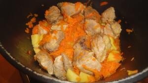 P.S. Мясо и морковь уже обжарены. В казан "пошла" картошка.