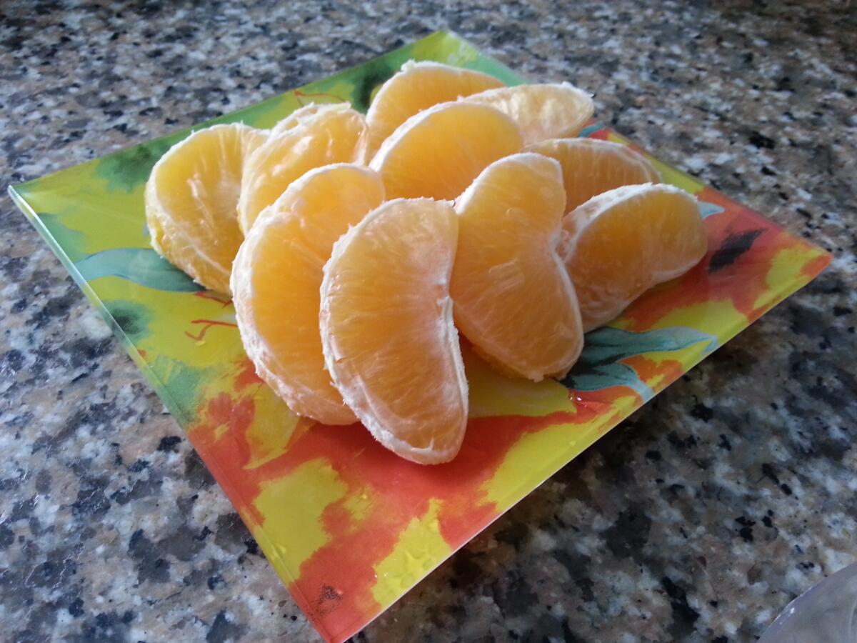 Дальше следует приготовить начинку для торта. Для этого апельсин нужно очистить, разделить на дольки. Каждую дольку разрезать напополам (так выделится больше сока, и выпечка будет ещё вкуснее). Пересыпать с сахаром и оставить примерно на 20 минут. За это время выделившийся сок более-менее растворит сахар. Заодно и тесто немного настоится.