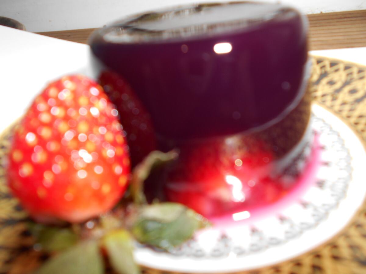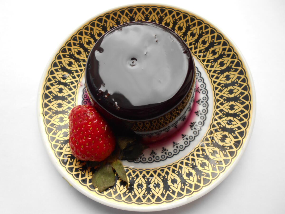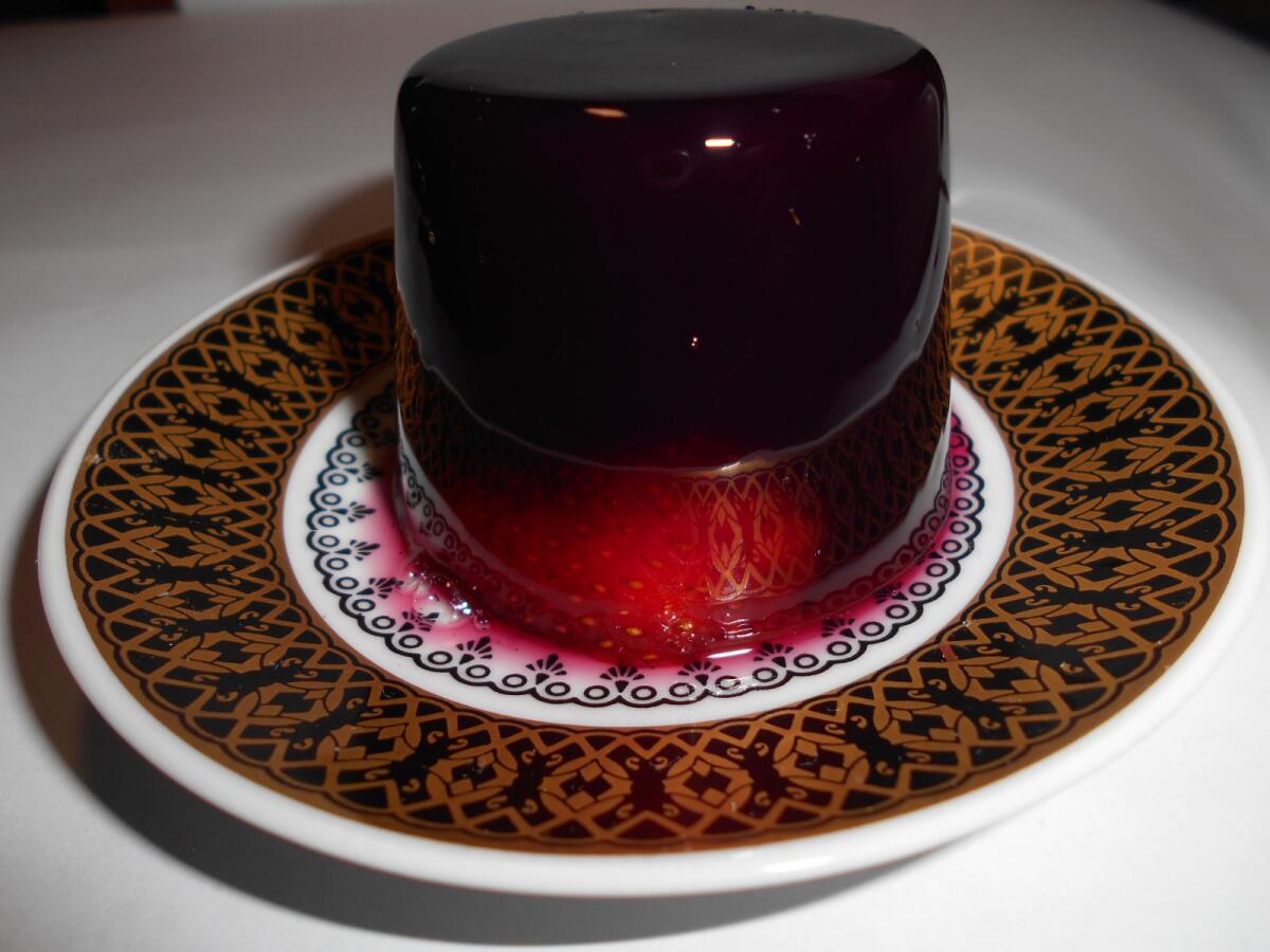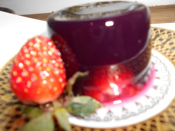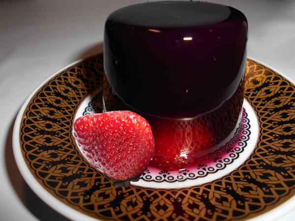 Цвет — просто потрясающий. Но вот чтобы сфотографировать это великолепие во всей красе, нужно иметь таланты, уметь ставить свет, гасить блики и всё такое прочее. Видите, как просвечивает клубничка на донышке десерта? Как там отражается рисунок блюдца? Мне стоило больших трудов это заснять.