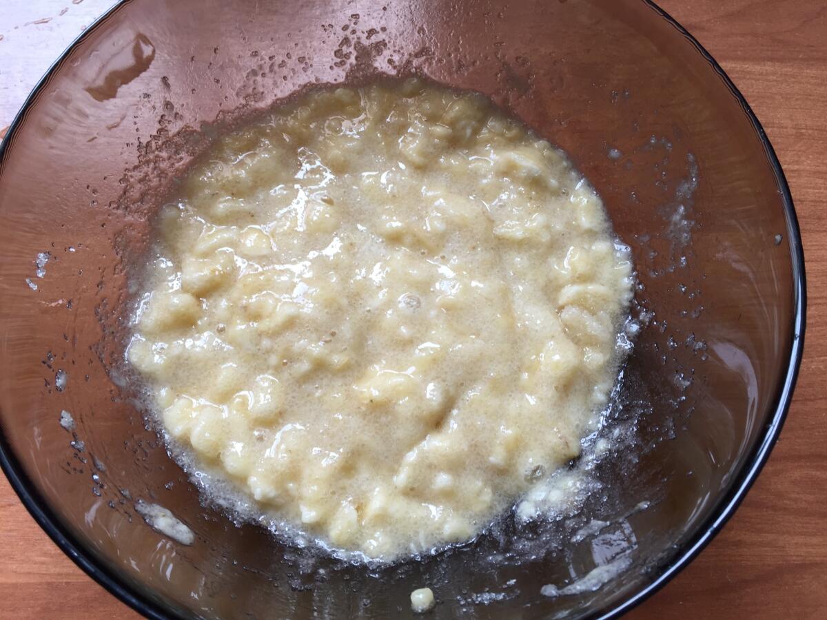 Для начала намоем и очистим бананы, разломаем их в миску и раздавим вилкой, добавим сахар, имбирь и взобьём. Затем добавляем, соль, соду, яйца, молоко, мелко порезанные орехи и кокосовую стружку. Помещаем тесто в смазанный растительным маслом противень, накрываем фольгой и отправляем в духовку при температуре 180 градусов на 30 мин. Через 30 минут снимем фольгу и печём ещё 15 минут.