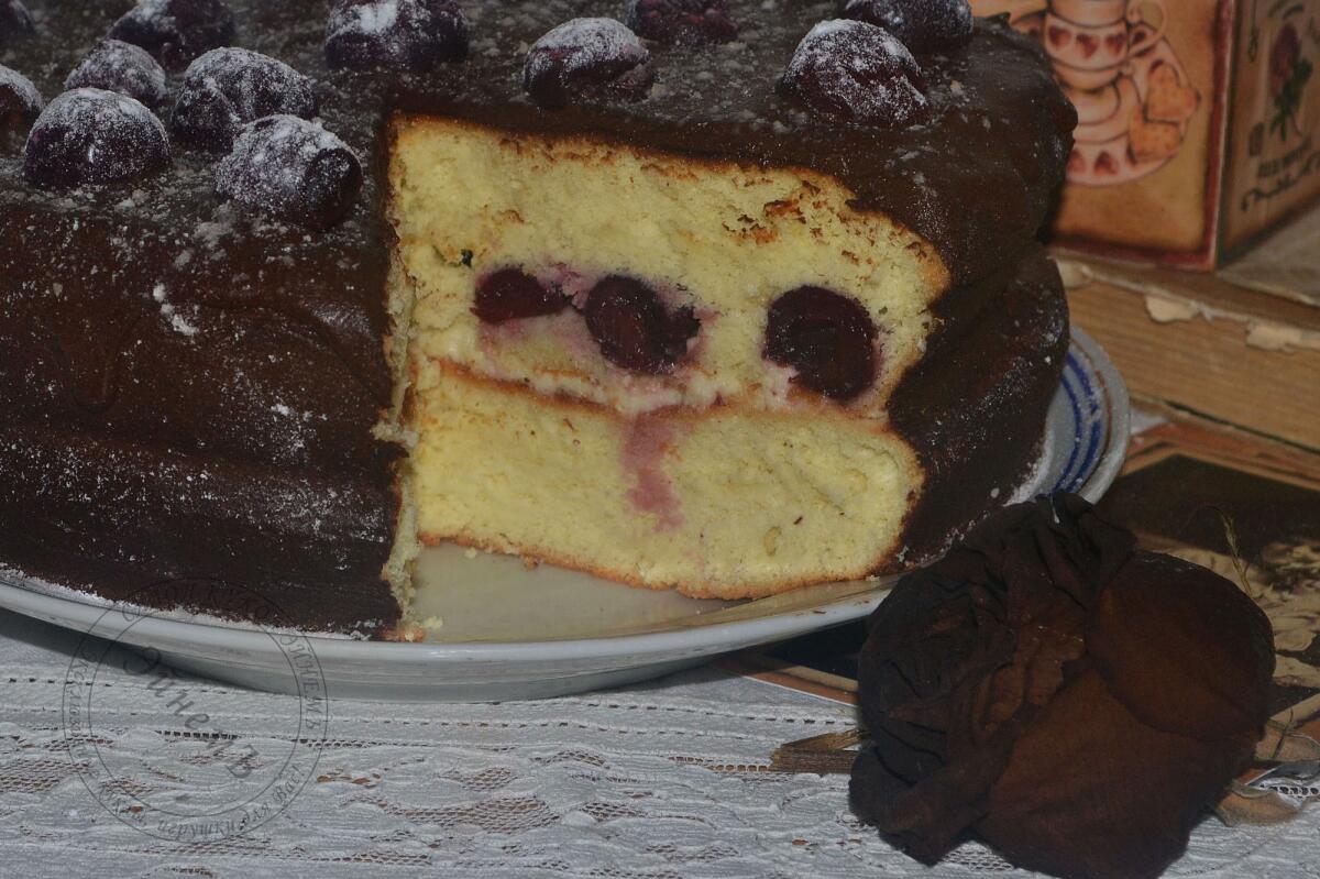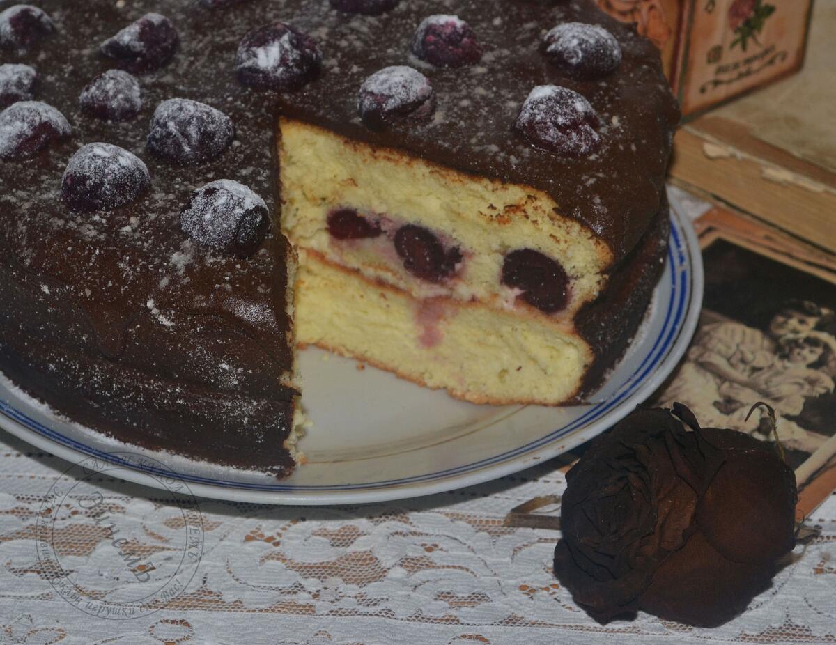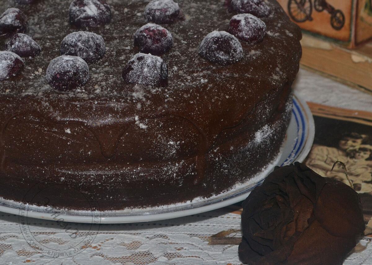 Поверхность торта украсить оставшимися вишенками и сахарной пудрой для имитации заснеженности.