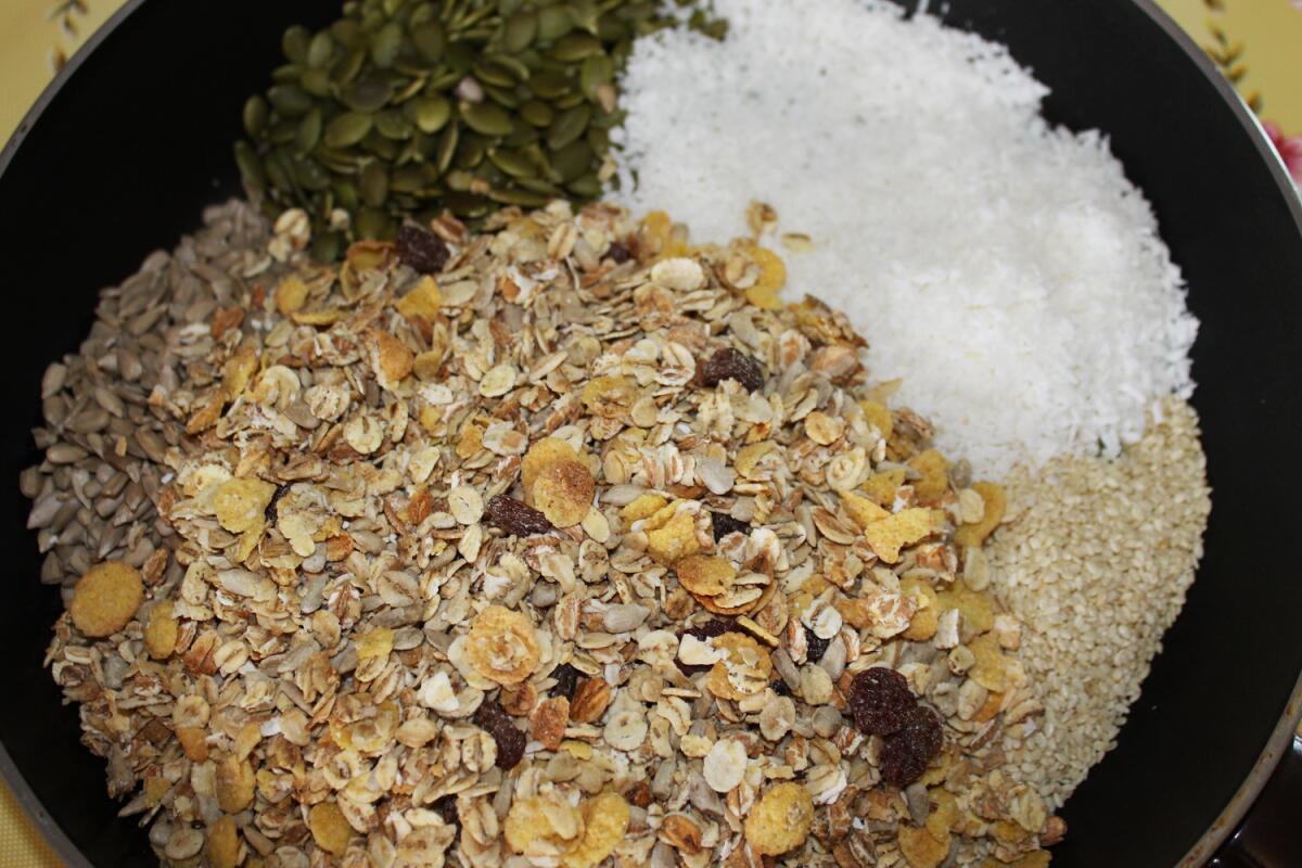 Семена, кунжут, кокос и мюсли (если мюсли уже запечённые, то их не используем в этом этапе) засыпаем на сухую сковороду.