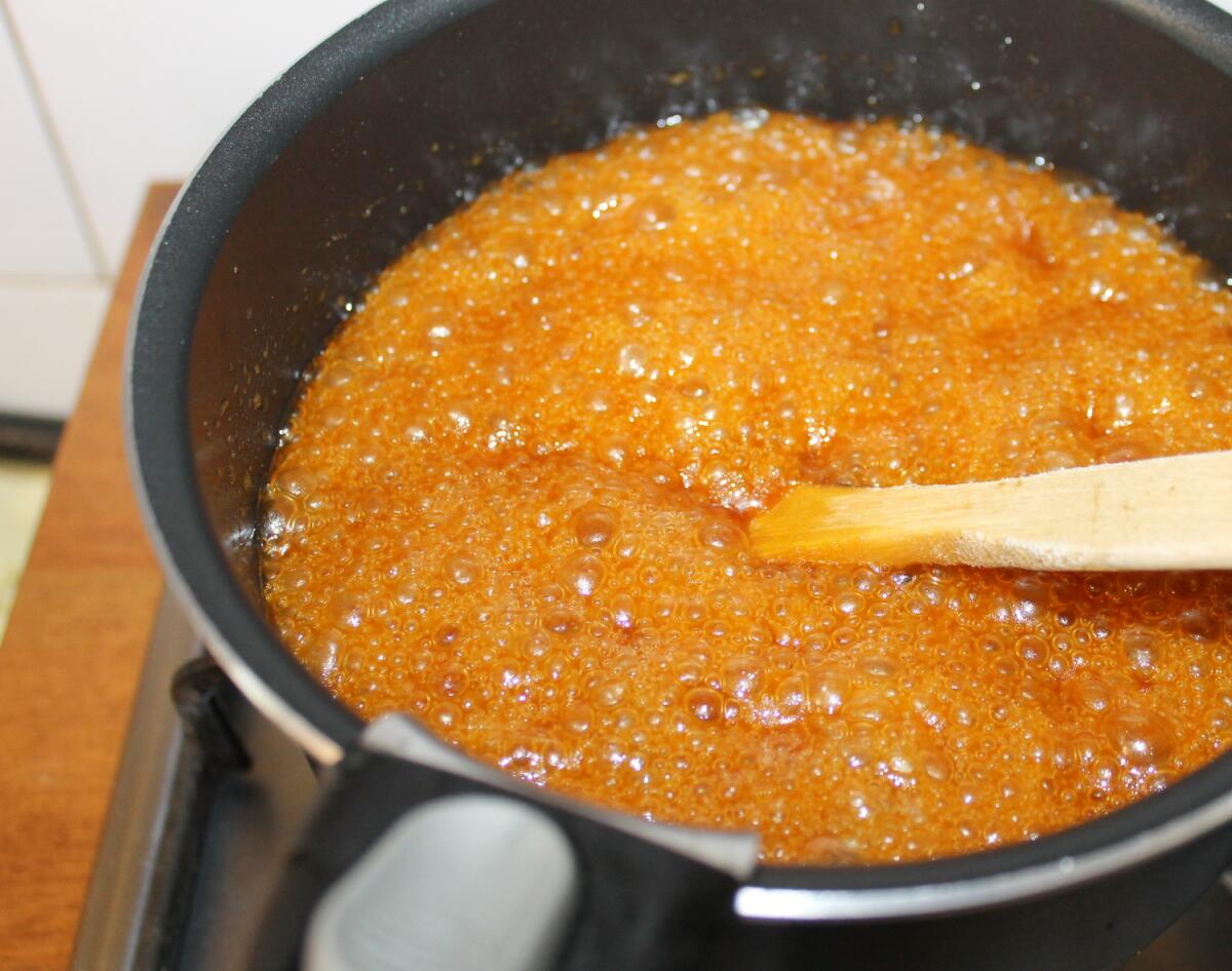Постоянно помешиваем, пока сахар не разойдётся полностью, и оставляем на малом огне вариться до загустения. Сироп легко проверить на готовность с помощью холодной воды. Если капля его не будет растекаться на поверхности воды, а будет тонуть плотной капелькой — в этом случае сироп готов.