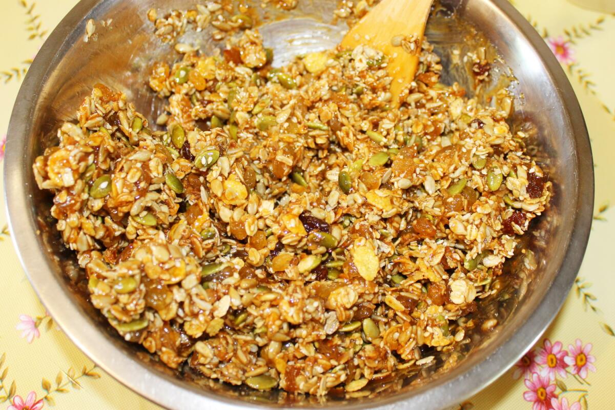 Как только смесь станет золотистого цвета, снимаем с огня и добавляем изюм. (Если мюсли запечённые, то пришло время добавить и их).