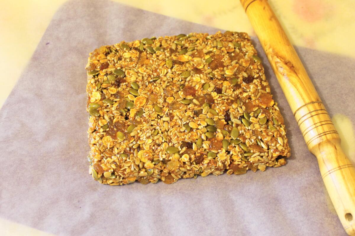 Далее выкладываем ещё горячую массу на пекарскую бумагу и быстренько формируем аккуратный кирпичик, уплотняя массу как можно лучше. Воспользуйтесь скалкой для удобства. Можете использовать большие плоские формы, как вам будет удобнее.