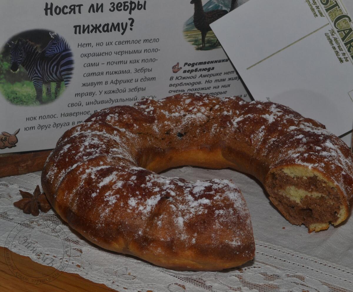 И испекли зебру не кровожадным, конечно, способом, а в виде кекса, носящего одноименное с этим животным название. Эта весьма простая домашняя выпечка внутри получается неровно-полосатой, что отображается на разрезе. Кулинарный рецепт данного пирога появился достаточно давно, в СССР, во времена тотального дефицита, но и по сей день весьма актуален. А пекли мы его с Максом следующим образом…