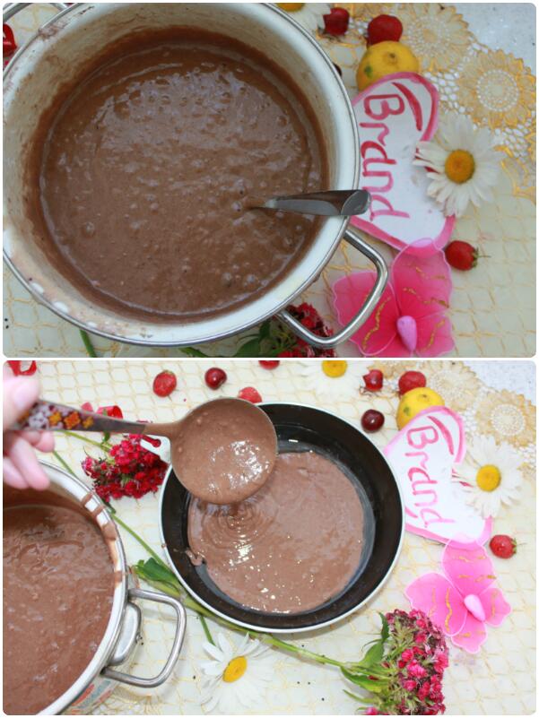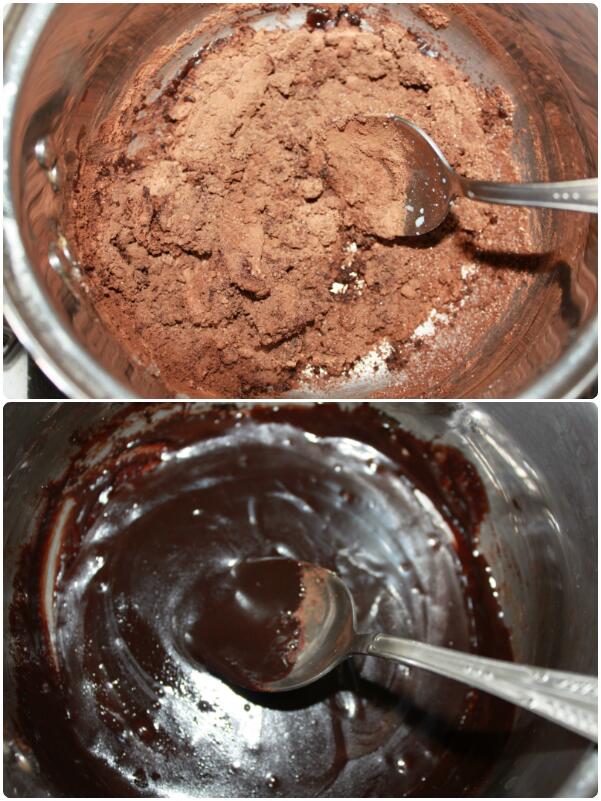 Все ингредиенты перемешиваем и варим на медленном огне, постоянно помешивая, пока не образуется «топленый шоколад».