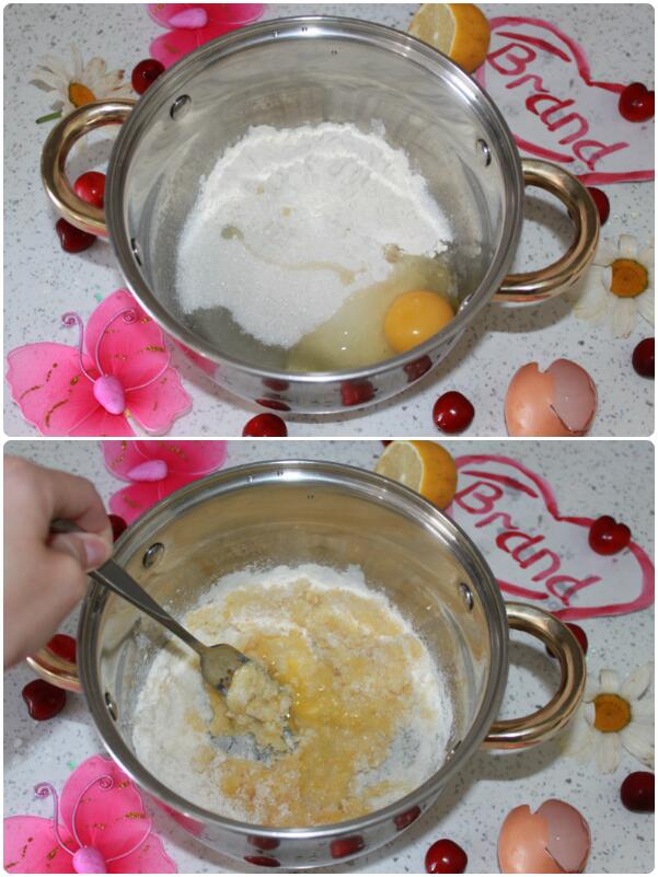 Смешиваем сахар и муку. В смесь вбиваем яйцо и перемешиваем. Вливаем в получившуюся массу молоко.