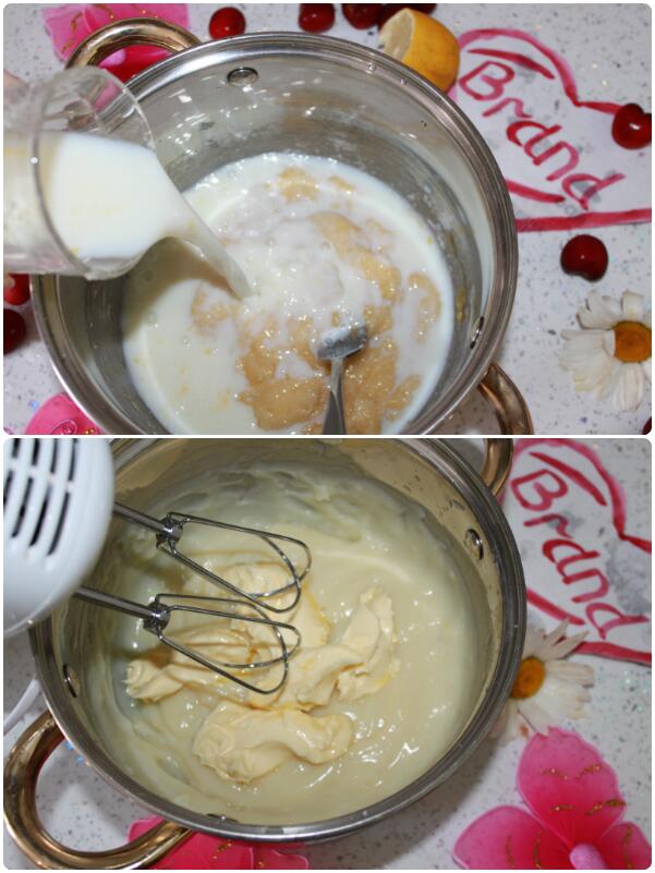Затем доводим смесь до кипения и, не переставая помешивать, варим до загустения на очень слабом огне. После массу остужаем и взбиваем с маслом.