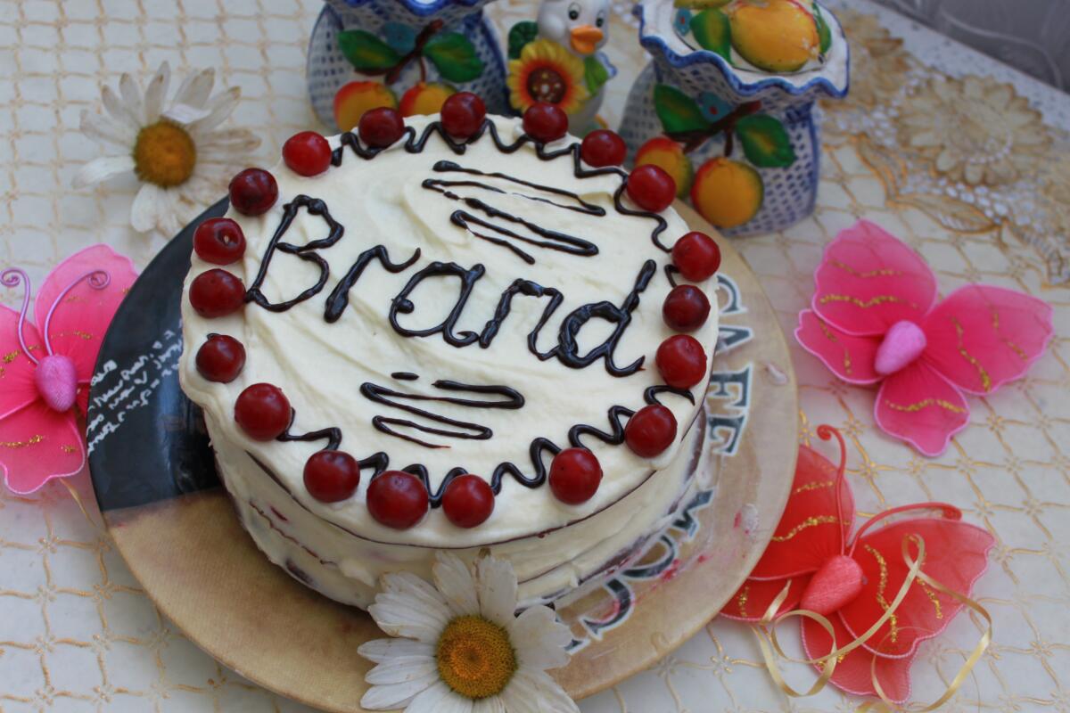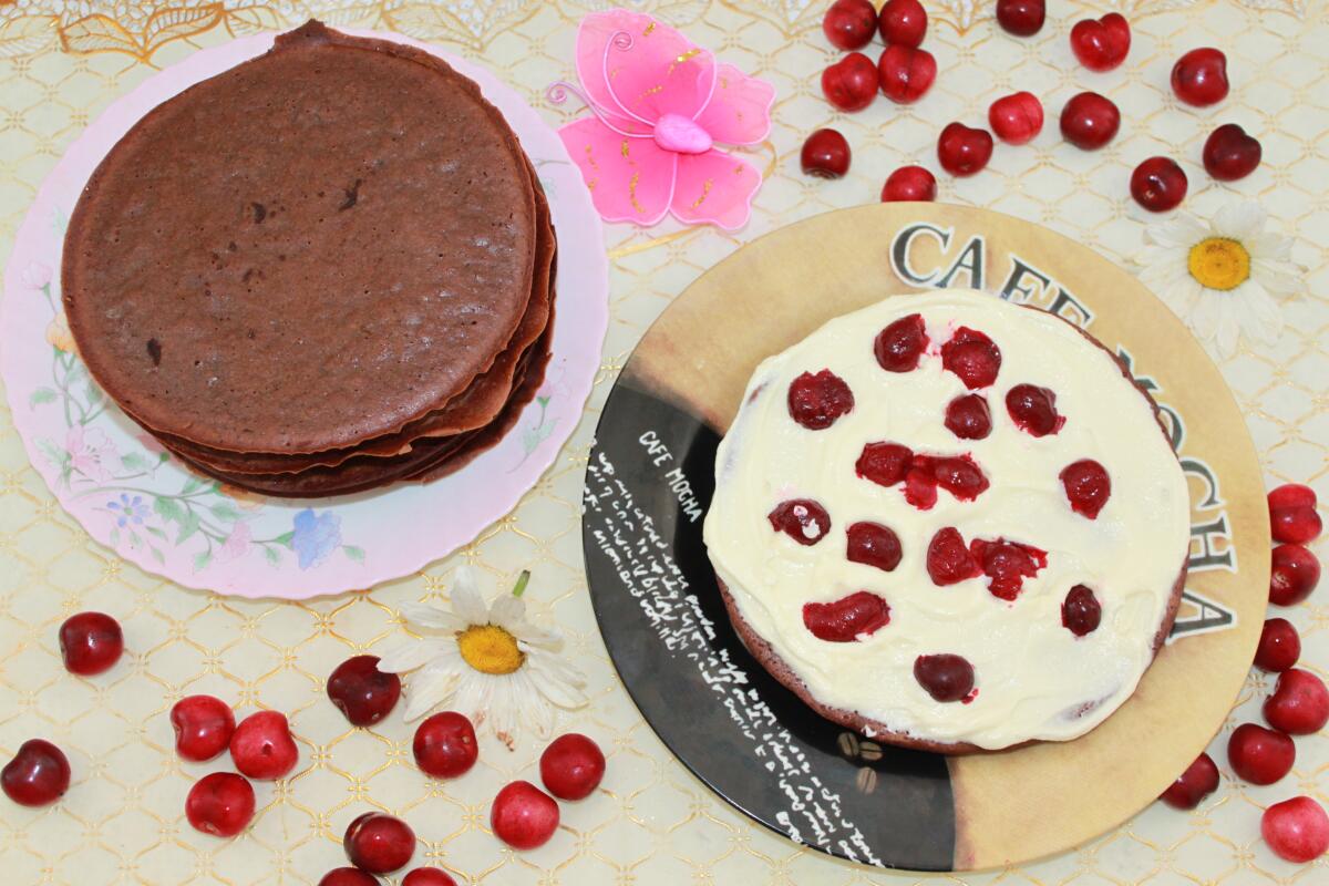 Если под рукой есть ягодки, то можно положить их на крем между коржами. Я, к примеру, использовала вишню, она придала ему дополнительную изюминку.