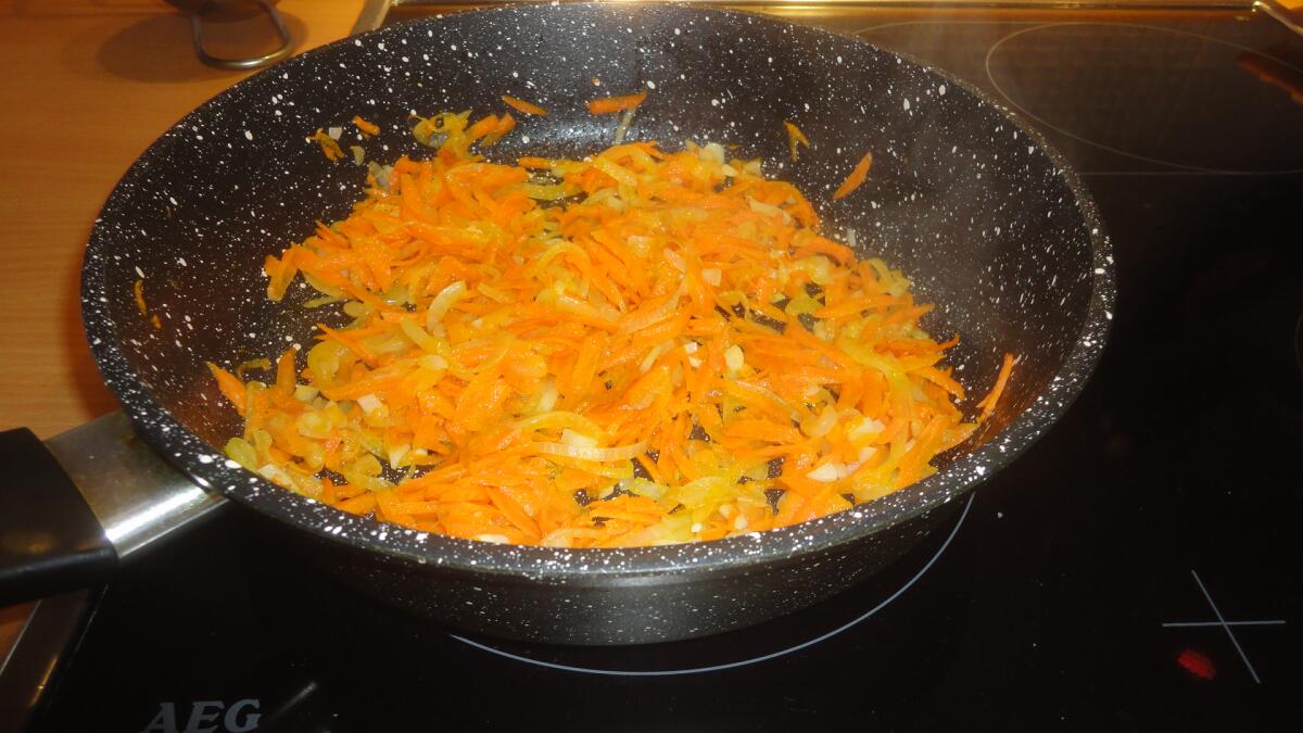 Чистим для этого луковичку, пару средних морковок и 3−4 зубчика чеснока. Лук шинкуем полукольцами, морковь трём на крупной тёрке, чеснок мелко рубим и чуточку (для усиления запаха) давим обухом ножа.
