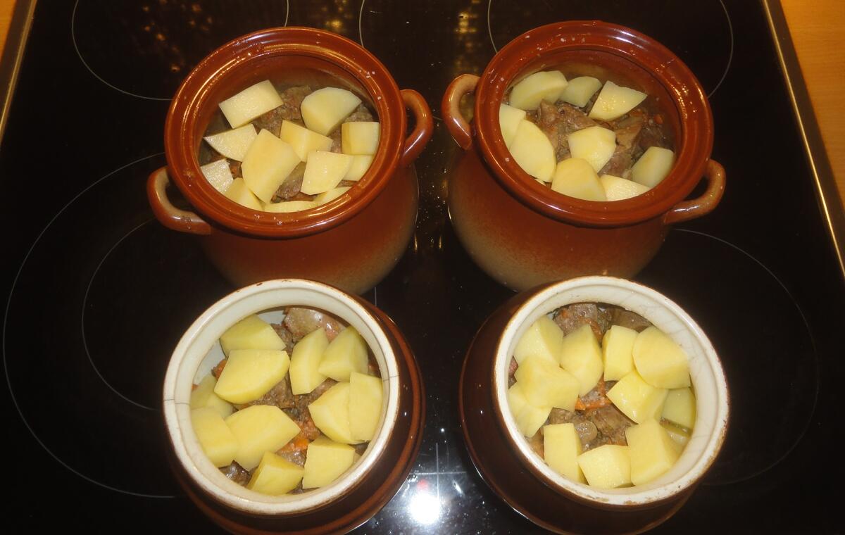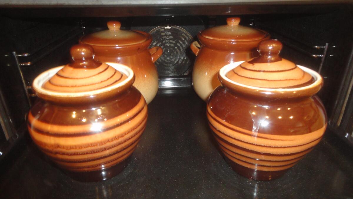 Каждый из слоёв, по мере их закладки, присаливаем. Заливаем в каждый из горшочков по трети стакана (граммов 70−80) нежирных сливок. Закрываем их крышечками и часа на полтора (плюс-минус, определяемый по запаху готового блюда) отправляем в духовку, разогретую градусов до 160−170.