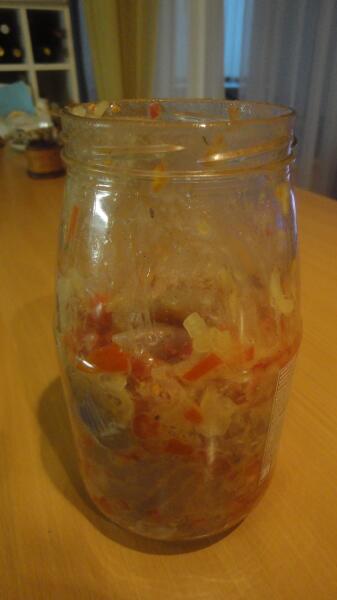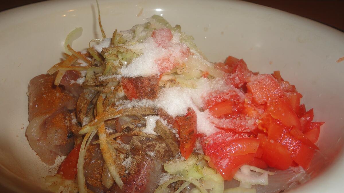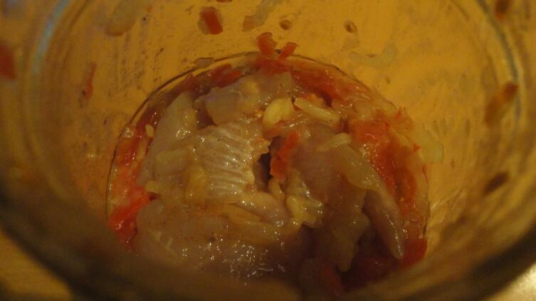 Порезали помидор? Отправляем его в миску к филе, вдогонку за луком. Высыпаем туда же столовую ложку соли с горкой и чайную (уже без горки) сахара. Перчим, перемешиваем содержимое миски и отправляем его в трехлитровую банку. «Кольчужка» для нашего сига великовата, но в данном случае — как раз то, что надо. Время от времени потряхивая банку, можно перемешивать её содержимое. Часто этого делать не стоит, но раза два-три за день — не возбраняется.