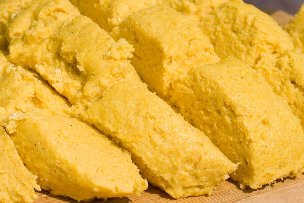 Когда каша окончательно загустела — так, что ложку не провернешь, мамалыга готова. Остается вывернуть ее на блюдо, немного примять и придать ей форму круга (квадрата, ромба, овала — на ваш вкус). Затем порезать на небольшие кусочки и съесть.