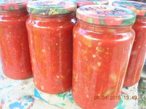 После этого положить в кастрюлю нарезанный полосками (по желанию можно и квадратиками любого размера) сладкий перец, две-три измельченные луковицы и кипятить еще полчаса. Теперь можно разливать по банкам и закатывать.