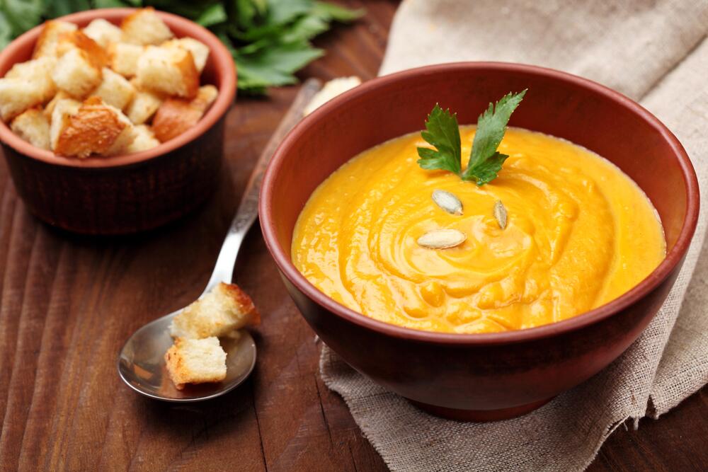 Потребуется: мякоть тыквы (в зависимости от количества порций), лук репчатый (2 шт.), 2 ст.л. растительного масла, 2−3 зубчика чеснока, 200 г твёрдого сыра, сливки (500 мл), сухарики, зелень, соль, перец (по вкусу).
