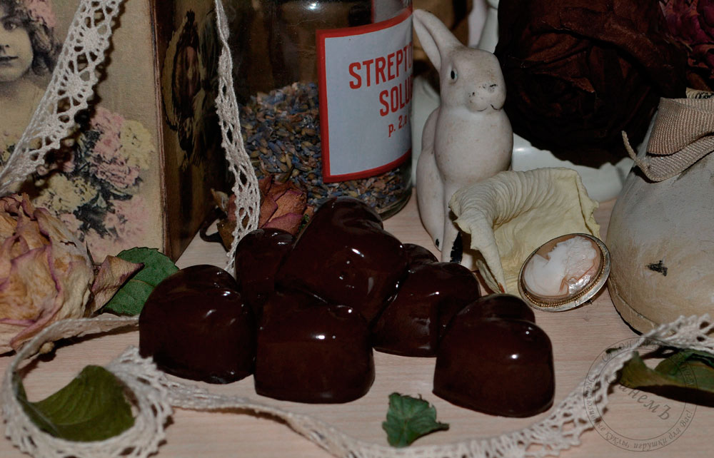 - Далее поставить сотейник на малый огонь или водяную баню, прогревать смесь, постоянно мешая ложкой. Как только шоколадная масса загустеет, снять с огня и сразу же разливать в силиконовые формочки (у меня в виде сердечек). Остудить и убрать в морозилку на 6−8 часов.