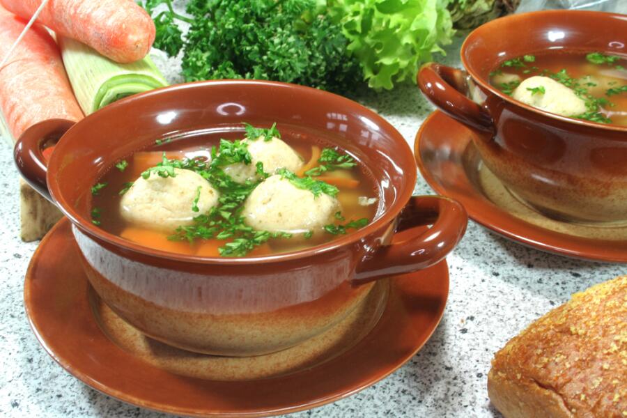 Клецки из мацы уже должны иметь форму, а не быть просто симпатичными «лунными» кусочками, как клецки из муки. Массу теста из мацы нужно разделить на небольшие части, сформировать из них шарики. Вот эти шарики необходимо разложить на доске и отправить в холодное место (вполне подойдет обычный холодильник) на час-два. В принципе, клецки можно сформировать тогда, когда начинается приготовление бульона. И как раз к тому моменту, когда бульон будет готов, клецки тоже будут готовы к закладке в кастрюлю.