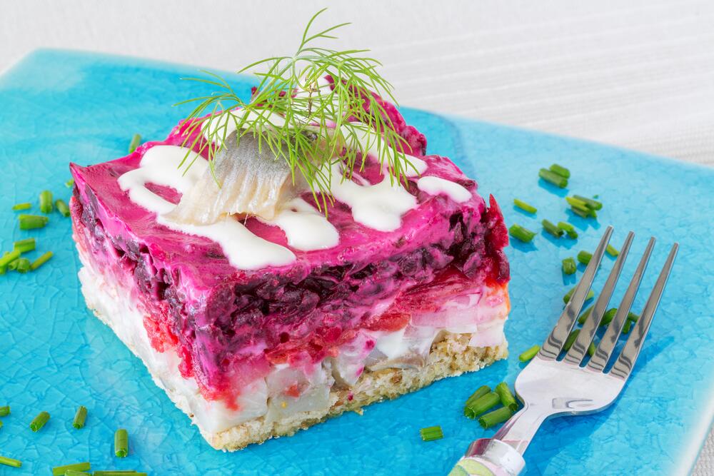 Ну и на закуску: селедка под шубой — классика свекольного жанра. Для этого блюда требуется филе сельди, картофель, морковь, свекла, репчатый лук, яйца, майонез.