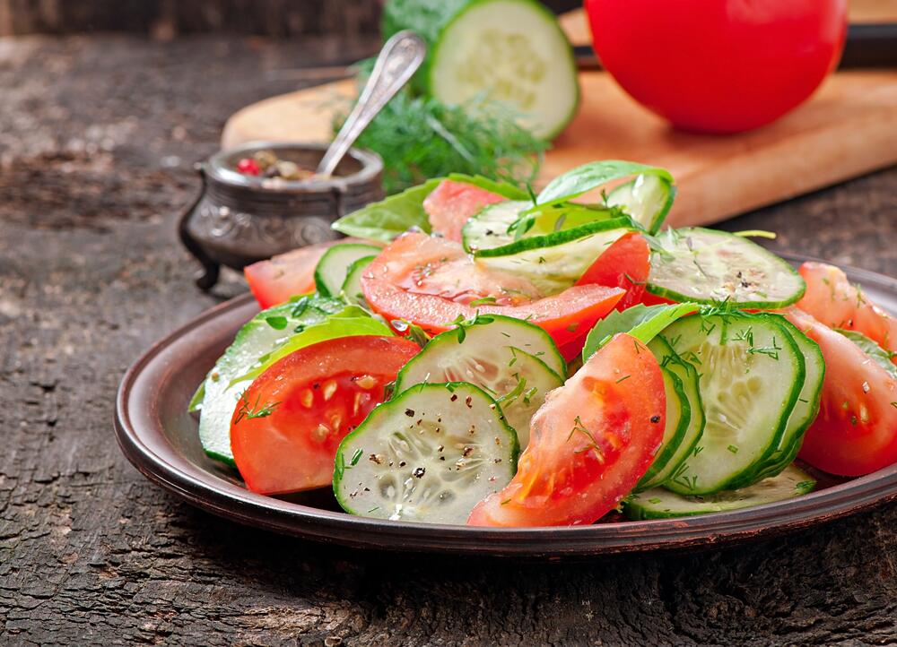 Еще одно небольшое усложнение — добавим дополнительный ингредиент: свежий огурец. Получим классический салат из томатов и огурцов. Также можно добавить капусту, сладкий перец, различную зелень. Салат из томатов и огурцов обычно заправляется сметаной, а вот при добавлении сладкого перца гораздо лучше подходит растительное масло.