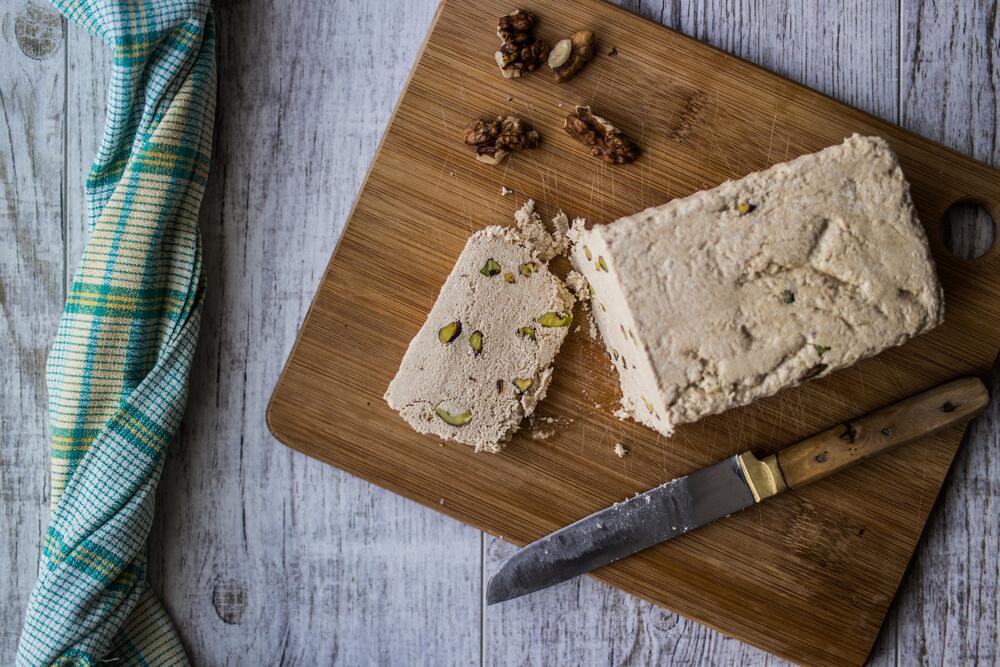 Снимите с огня и выложите халву в большую форму или в маленькие формочки. Сверху посыпьте корицей и молотыми грецкими орехами. Оставьте десерт до полного остывания — и вкуснейшая халва готова к употреблению.