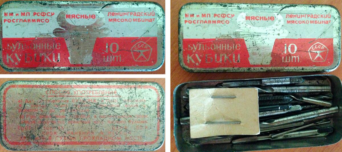 Был этот бульон натуральным или из кубиков, не знаю. О существовании бульонных кубиков в СССР знал, но не пробовал их ни разу. Упаковка из-под кубиков, уже как раритет, досталась мне от тестя, в которой он хранил мелкие сверла. Она и сейчас служит по тому же назначению.