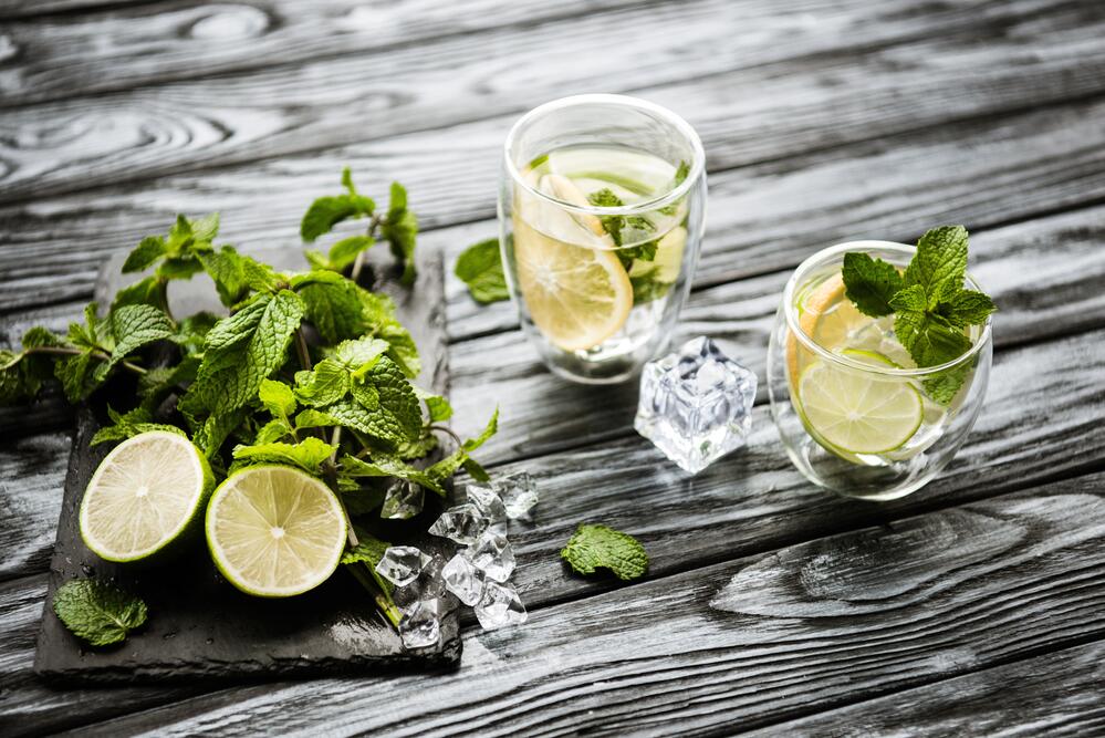 - Берем из холодильника лед и опускаем его по кусочку в каждый стакан с напитком. Лимонад готов — можно пить.