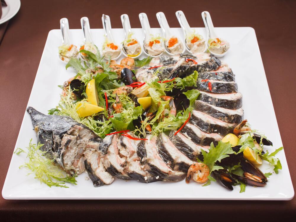 Отдельно для начинки нарезать раковых шеек, налимью печень, шампиньоны, влить туда сливочный бешамель. Отправить начинку на холод.