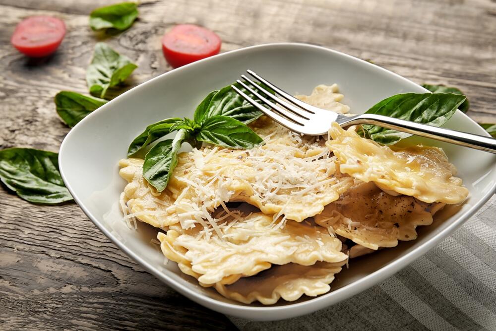 Приготовить фарш из обжаренного лука, рубленого рыбного филе, соли, перца, зелени, мускатного ореха. Приготовить тесто для равиоли. Раскатать и разрезать на треугольники. Положить фарш и защипать края. Сложить ушки в смазанный маслом сотейник, залить соленым кипятком и сварить до готовности.