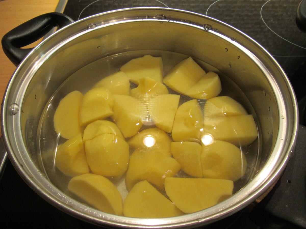 Первым делом почистил я с пяток средних картофелин. Каждую из них развалил на четыре части, залил водой так, чтобы она только-только порезанные клубни покрывала, и поставил кастрюльку на плиту. Вода закипела, пенку снял, присолил чуток, огонь убавил и крышкой закрыл. Пусть варится.