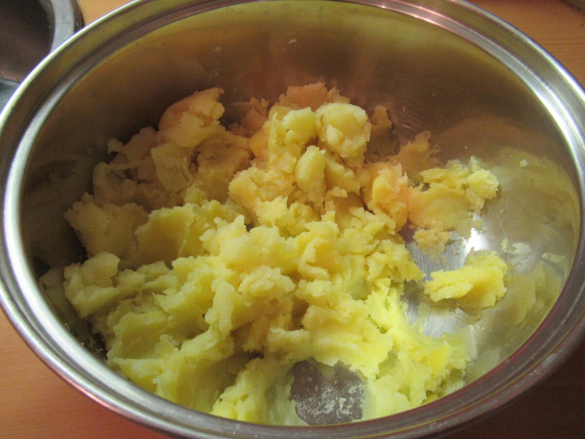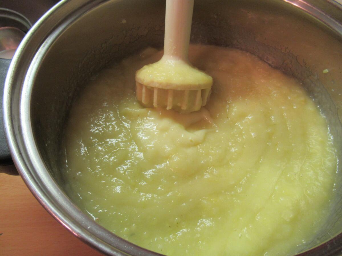 Как картошка и жидкость остынут, разминаем первую толкушкой. Чистим три-четыре зубчика чеснока, режем их некрупно и отправляем в кастрюлю с картошкой. Заливаем всё той жидкостью, в которой варилась картошка, и включаем блендер. Пара минут — и у нас в кастрюле кашеобразное картофельное пюре с характерным запахом чеснока.