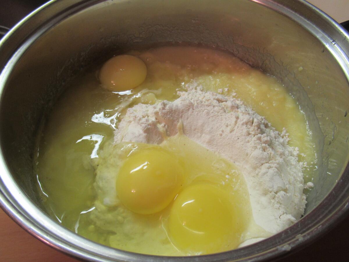 В эту же кастрюлю отправляем три столовых ложки подсолнечного масла, одну столовую ложку (без горки) сахара, треть чайной ложки соли, четыре сырых яичка, полтора стакана пшеничной муки и стакан молока.