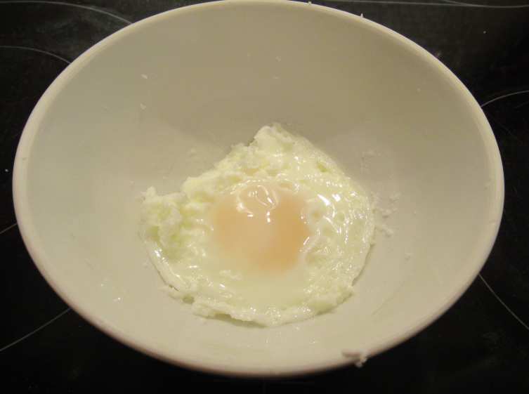 У меня, при максимальной мощности, достаточно 30 секунд, чтобы сырое яйцо трансформировалось в яйцо пашот. Тридцать секунд! И всё! Никаких кастрюль, воды, уксуса, раскручивания жидкости в воронку и прочая, прочая, прочая. Минута, максимум полторы (если отсчет времени вести с того момента, как вы достали сырое яйцо из холодильника) — и яйцо пашот готово.