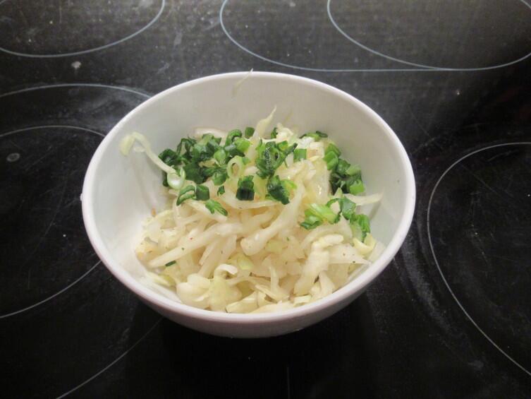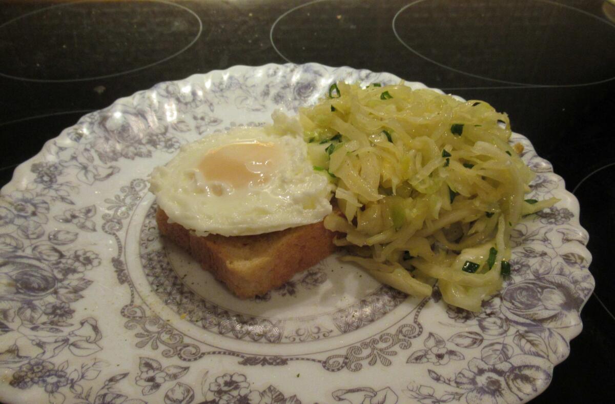 Я так в дополнение к хлебному тосту пошинковал лист капусты и порубил пару перьев зеленого лука. Но их легко заменить чем-то иным: порезанным кружочками огурцом или помидором. Или таким же кружком зеленой маргеланской редьки. Последнюю можно положить прямо на хлебный тост. А уже на него — яйцо пашот. И тогда к этому своеобразному сэндвичу даже вилка будет не нужна.