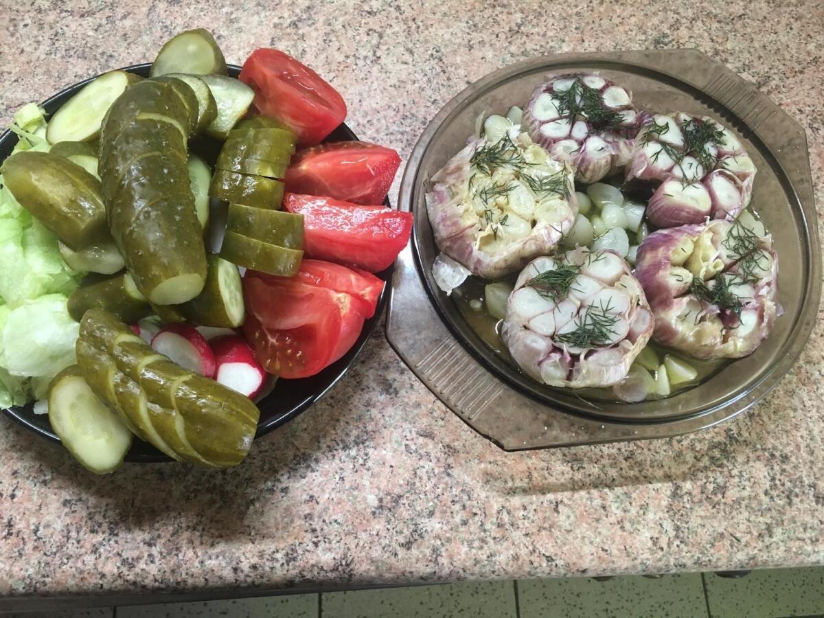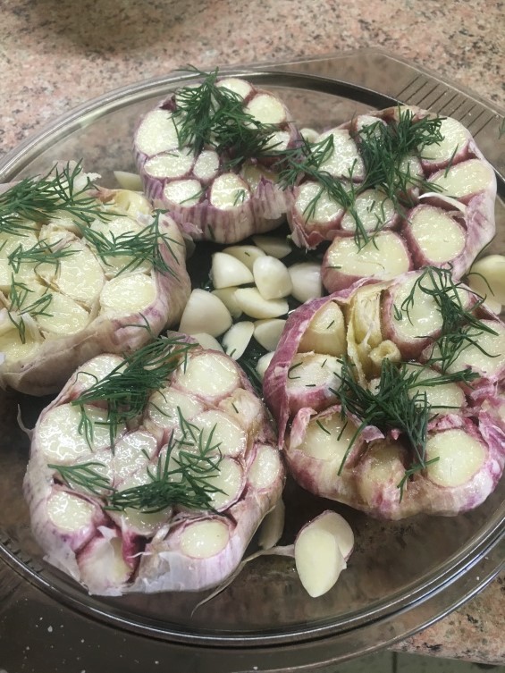 На срез каждой головки необходимо налить масла, лучше оливкового, посыпать солью и можно положить немного зелени.