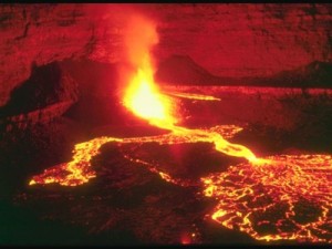 Я делала подобный вулкан, только сладкий (торт), сверху устанавливала свечку и поджигала, а по вулкану лилась лава - густой вишневый сироп.