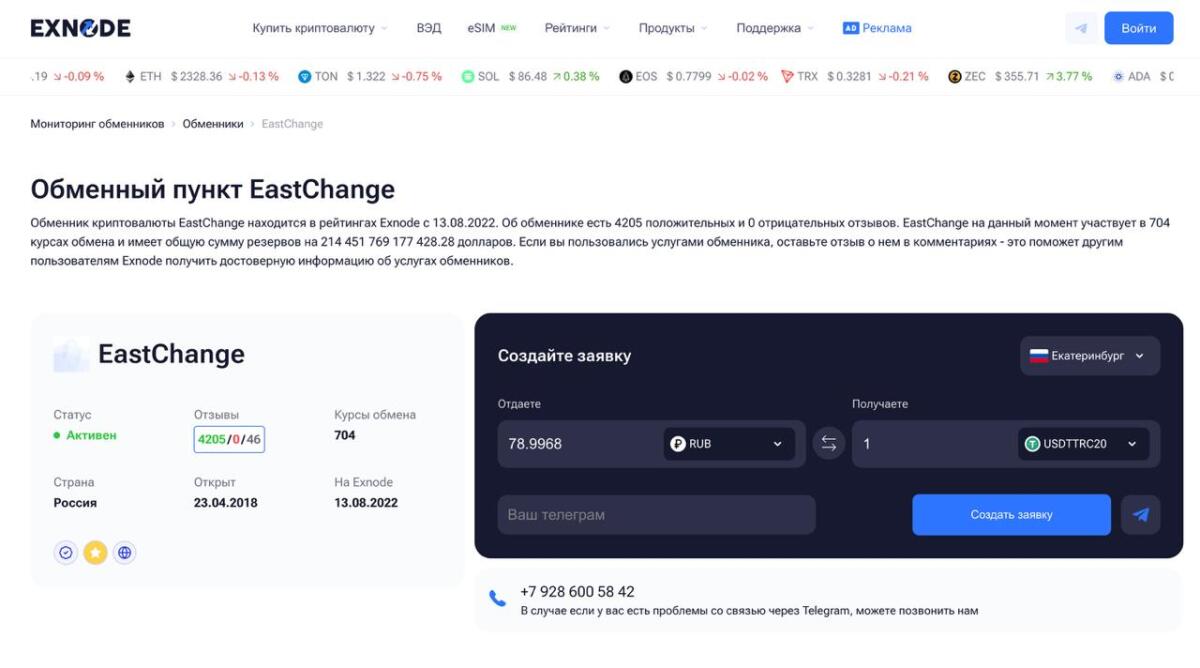 EastChange — один из наиболее узнаваемых сервисов в сегменте оффлайн-обмена. Площадка работает через предварительную заявку: клиент выбирает направление обмена, фиксирует курс, после чего получает подтверждение и адрес офиса. Сервис поддерживает операции с популярными активами, включая USDT, BTC и ETH, а также сделки с наличными в рублях и долларах. Дополнительным фактором доверия остаётся высокая активность на мониторингах: у обменника большое количество положительных отзывов и значительный резерв по направлениям обмена.