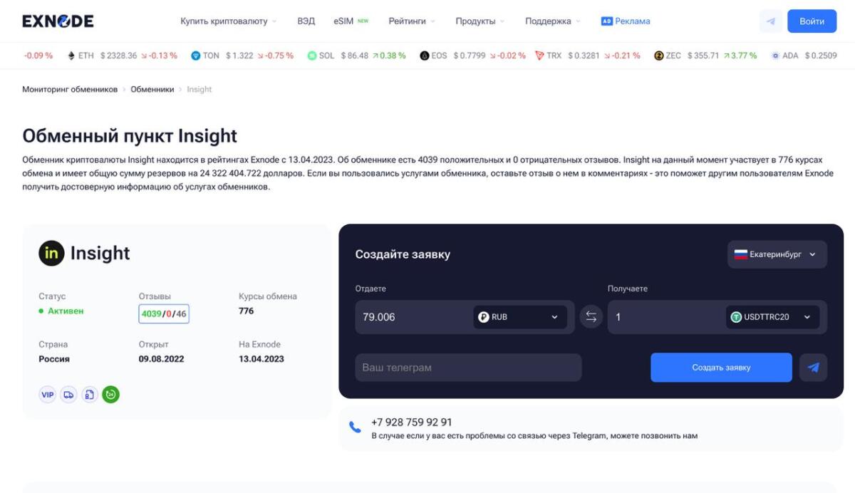 Insight активно развивается как сервис для оффлайн-обмена криптовалюты и предлагает классическую модель работы через офис. На сайте доступно оформление заявки, после чего менеджер подтверждает курс и согласует время встречи. Площадка поддерживает покупку и продажу USDT, BTC, ETH и других популярных активов, а также расчёты наличными.