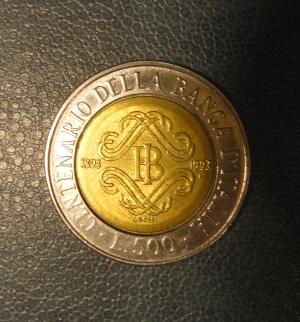 На разживку. Мы, в своем большинстве, из советского прошлого. Поэтому, наверное, вес той или иной монеты для многих из нас определяется не её стоимостью на нумизматическом рынке, а той памятью, которую она несет в себе. Вот, итальянская монета номиналом 500 лир. Выпущена в обращение в 1993 году в ознаменование 100-летия Банка Италии. Монета интересная. Биметаллическая. Внутренний латунный круг с вензелем Банка Италии вштампован в никелевую окантовку большего диаметра. О том, как ко мне попала эта монета, я как-то рассказал в материале "Сколько стоит мешок Леонардо да Винчи?"