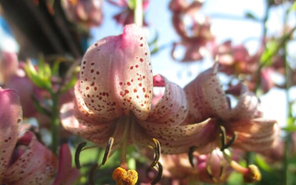 Поникшие цветки с длинными тычинками с фиолетовыми пыльниками собраны в негустые кисти. В благоприятных местах произрастания на кисти может быть до двадцати цветков. Полностью не раскрывшиеся бутоны напоминают нарядную чалму.