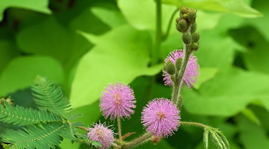 Цветёт мимоза стыдливая на протяжении всего лета. Мелкие цветочки собраны в пушистые шарики соцветий, их диаметр — 1,5−2 см. На фоне яркой ажурной зелени розовато-фиолетовые соцветия светятся, как волшебные ёлочные украшения.