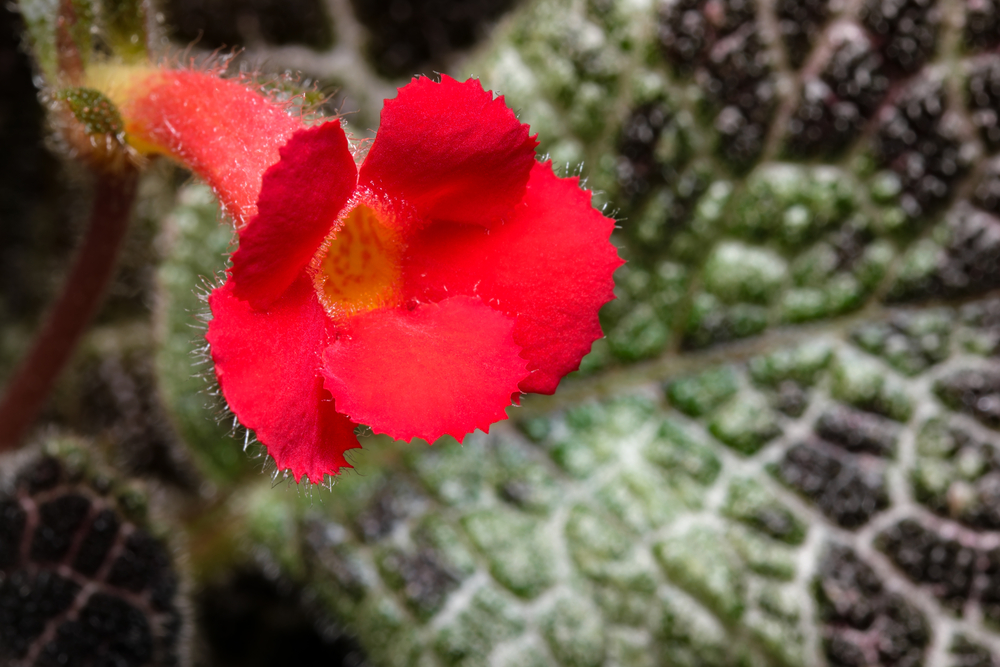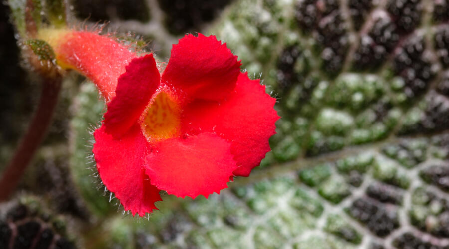 Надземные стебли растения немного опушены. Листья на коротких черешках расположены супротивно. В большинстве своём листья бархатистые и пёстро окрашены, что делает кустик необыкновенно красивым и нарядным. Листья держатся на растении несколько лет, что помогает сохранять декоративность.