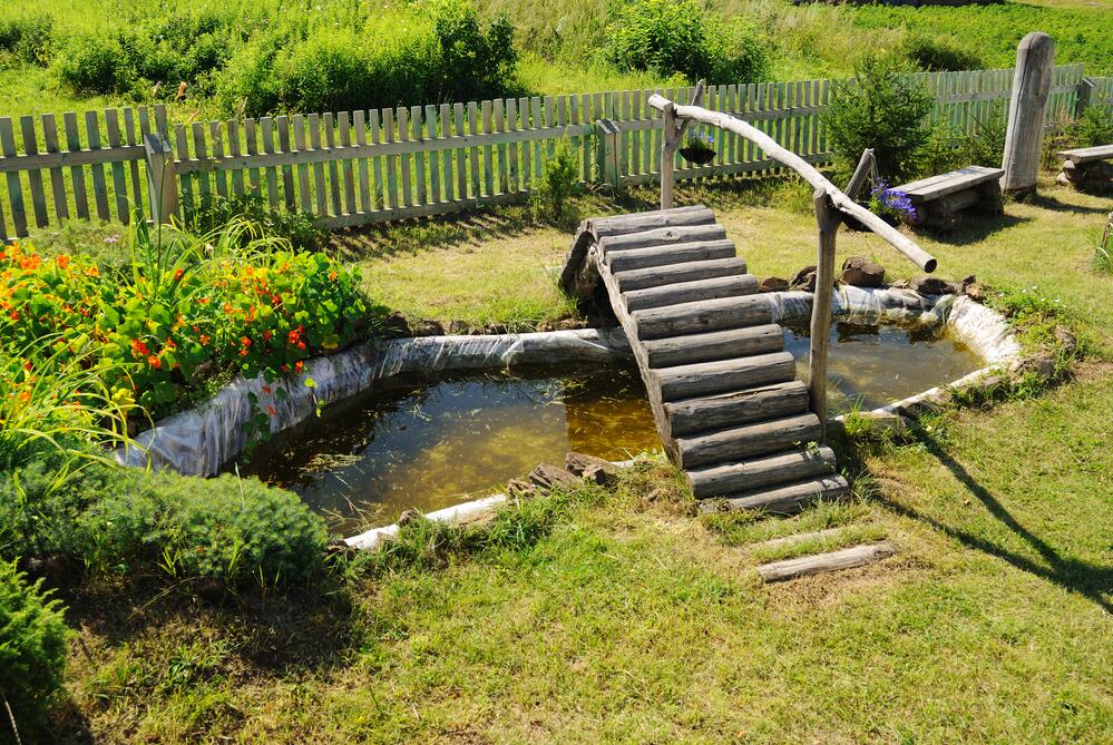 Можно создать на участке то, что в ландшафтном дизайне называют малыми архитектурными формами, к примеру, декоративный пруд. Конечно, если участок невелик, пруд тоже будет маленький, но тем не менее, даже самый крохотный водоемчик придает неповторимый шарм. При этом, все, что потребуется, это приобрести пластиковую заготовку (имеются в продаже) нужного размера, вкопать ее в землю и украсить по краям. Для украшения можно использовать камни, которые вы найдете при вскопке грядок.