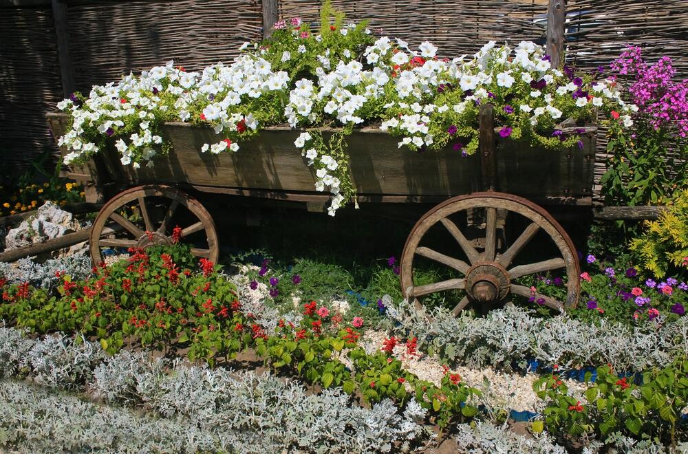 Очень красивые клумбы получаются из плетеной лозы. Для этого нужно по периметру будущей высадки цветов установить деревянные опоры (подходят достаточно толстые ветки деревьев, штакетник и так далее). Высота опор — это та высота, на которой будут расти ваши цветы. После того, как опоры установлены, они переплетаются очищенной от сучков и листьев лозой. В результате получится этакий плетеный «горшок», в который насыпается грунт и высаживаются цветы. При желании «горшок» можно покрасить.