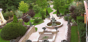 Так вполне можно превратить террасу у дома в навес под парусиной (убирая полог, если нет солнца), туда же выносить горшки с цветами и поставить каменную чашу или маленькую статуэтку. У террасы вполне можно сделать прямоугольные или извилистые ажурные «карманы» из низенького самшитового бордюрчика, и высадить в них кусты роз. А между розами высадить герань, пионы, наперстянку и дицентру, если место притенённое. Или лаванду, или ирисы и стахис, если солнечная сторона. Любители стриженых форм могут в таком розарии посадить шар самшита на штамбе (или три шара на одном стволе).